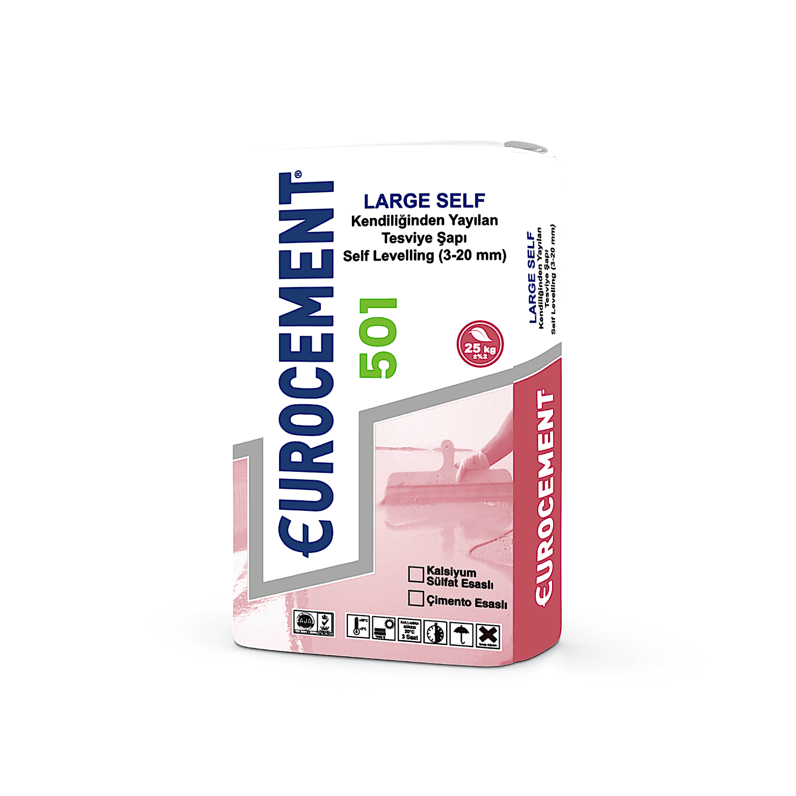 Eurocement Large Self 501, çimento esaslı, toz reçine ve modifiye polimer takviyeli, yüksek mukavemetli, istenilen kalınlıkta uygulanabilen, iç mekânlar için geliştirilmiş, kendiliğinden terazisine gelen, tek komponentli tesviye şapıdır.